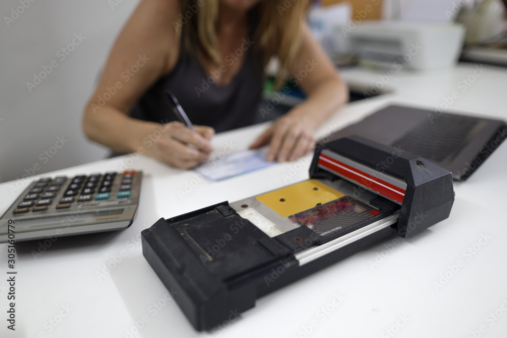 Clear Image Of Old Credit Card Imprinter Machine On The White Table With Defocused Female Wrettening Signature On Imprint Paper Work Background Stock Photo Adobe Stock